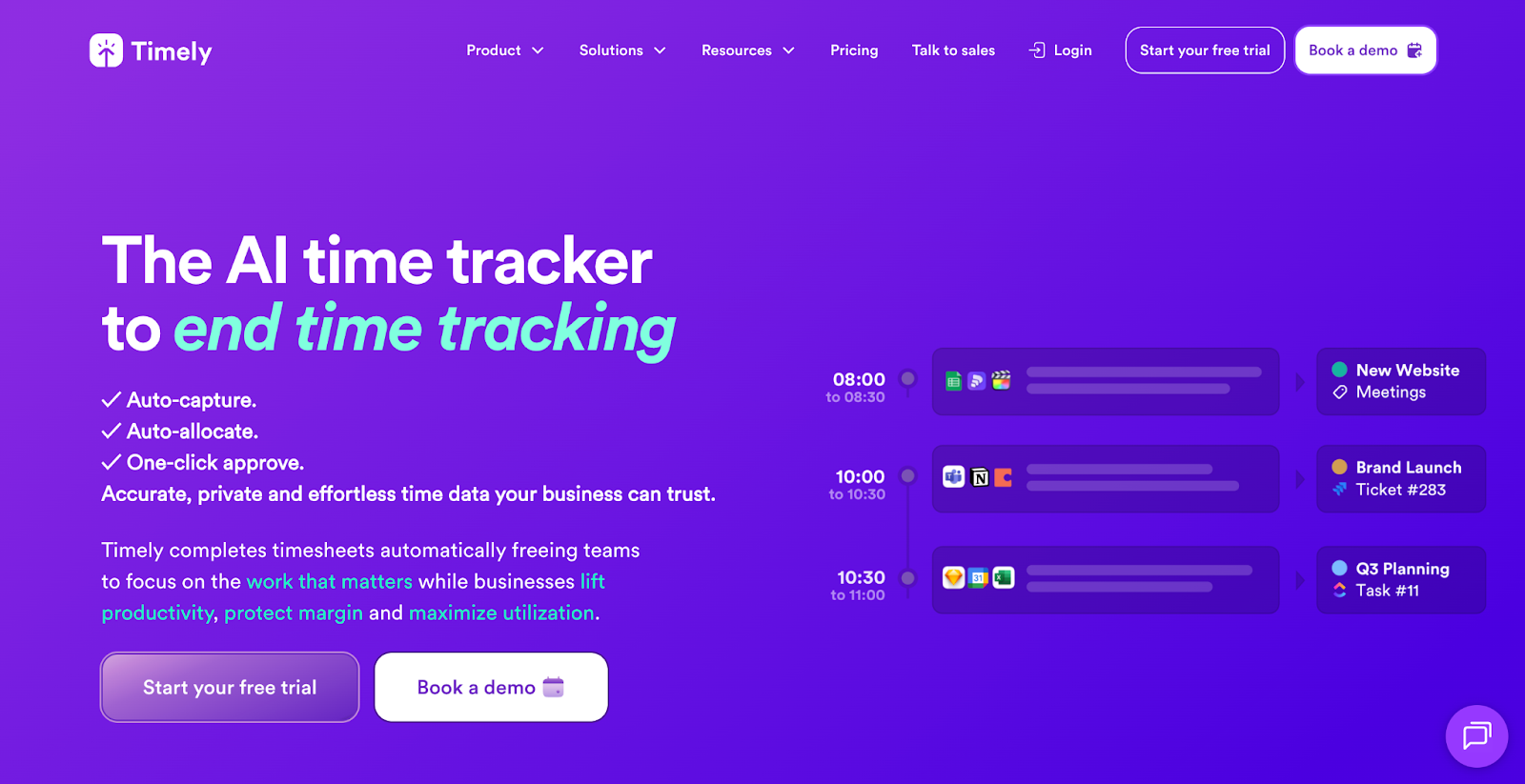 Timely is an automatic time tracking platform that records work activity in the background and turns it into structured timesheets. Instead of relying on manual timers, the software captures the apps, websites, and documents you work on and builds a private timeline of your day.
